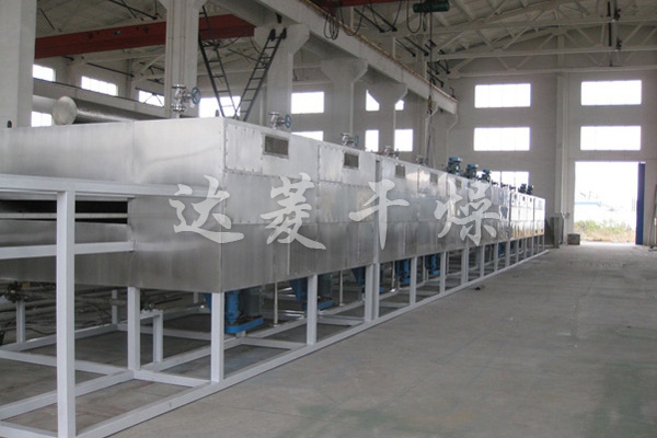 物料由加料器均匀地铺在网带上,网带一般采用12-60目不锈钢丝网,由传动装置拖动在干燥机内移动。干燥机由若干单元组成,每一单元热风独立循环,部分尾气由专门排湿风机排出,废气由调节阀控制,热气由下往上或由上往下穿过铺满物料的网带完成热量与质量传递的进程,带走物料水份。网带缓慢移动,运行速度可根据物料温度自由调节,干燥后的成品连续落入收料器中。上下循环单元根据用户需要可灵活配备,单元数量亦可根据需要选取。